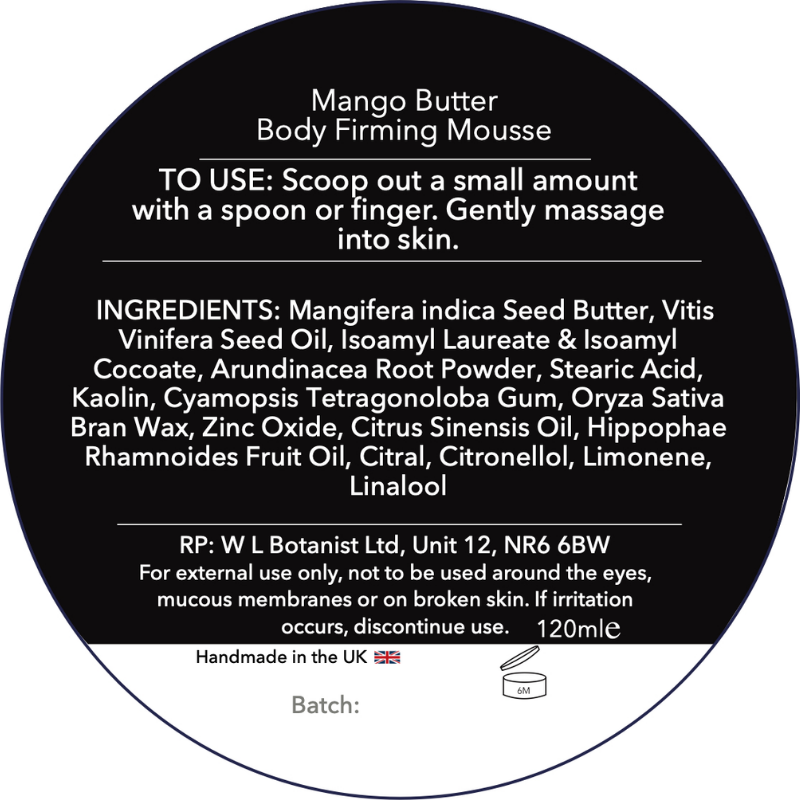 Mango Body Firming Mousse, with sea buckthorn oil, mango butter and sweet orange oil.